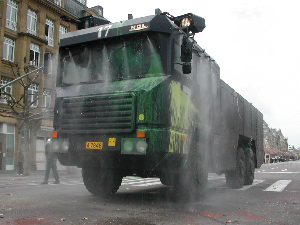 Canon à eau de marque "MOL" (à priori type MSB19), prêté à la Gendarmerie Nationale par la Gendarmerie Belge à l'occasion du sommet du G8 à Evian en 2003. 18 exemplaires ont été produits en 1987 pour la Gendarmerie Belge.